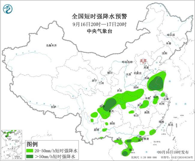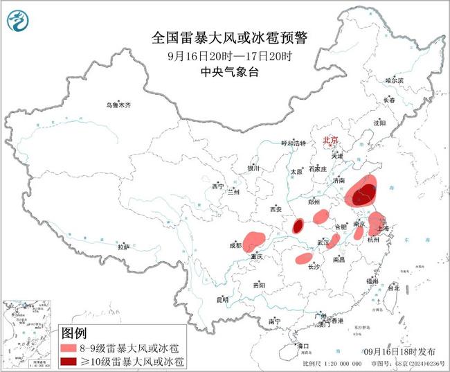 預(yù)計(jì)9月16日20時(shí)至17日20時(shí),黃淮南部、江淮、江漢、江南北部、四川盆地東部等地的部分地區(qū)將有8級(jí)以上雷暴大風(fēng)或冰雹天氣,其中,江蘇北部、湖北西北部等地的部分地區(qū)將有10級(jí)以上雷暴大風(fēng);黃淮南部、江淮、江漢、四川盆地、江南北部、華南南部等地的部分地區(qū)將有小時(shí)雨量大于20毫米的短時(shí)強(qiáng)降水天氣,其中,山東中東部和南部、安徽北部、江蘇中北部、四川東部、重慶西部、廣東西南部、海南島等地的部分地區(qū)小時(shí)雨量大于50毫米,最大可達(dá)70毫米以上。