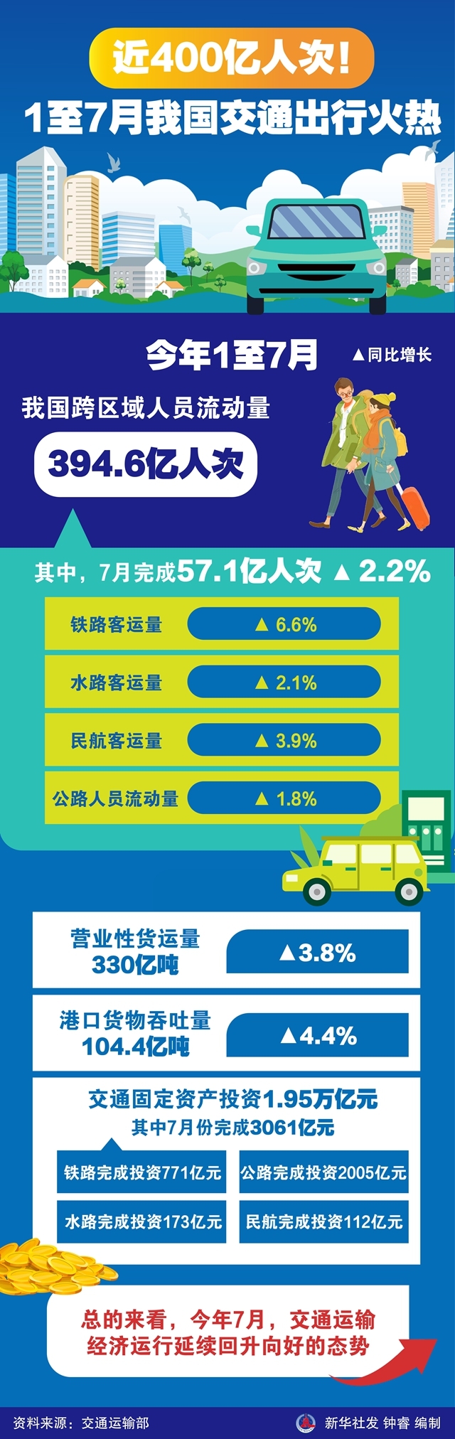 今年1至7月,我國(guó)跨區(qū)域人員流動(dòng)量達(dá)394.6億人次,同比增長(zhǎng)3.9%。