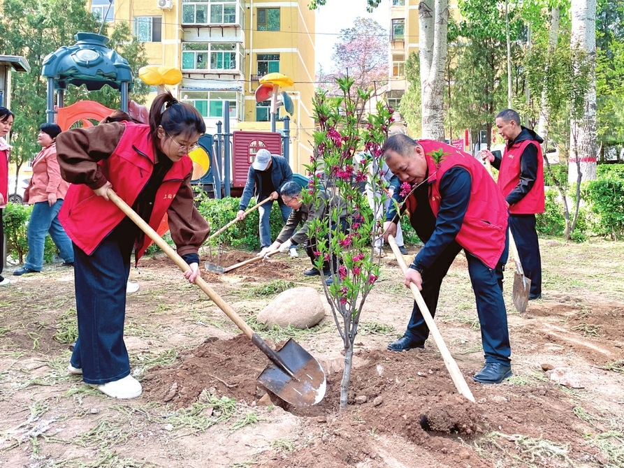 ????4月22日,在第57個(gè)世界地球日到來之際,陽泉市城區(qū)上站街道小陽泉南社區(qū)在綠礬溝小區(qū)游園開展植樹活動(dòng),為家園增綠。山西日?qǐng)?bào)記者高樺攝